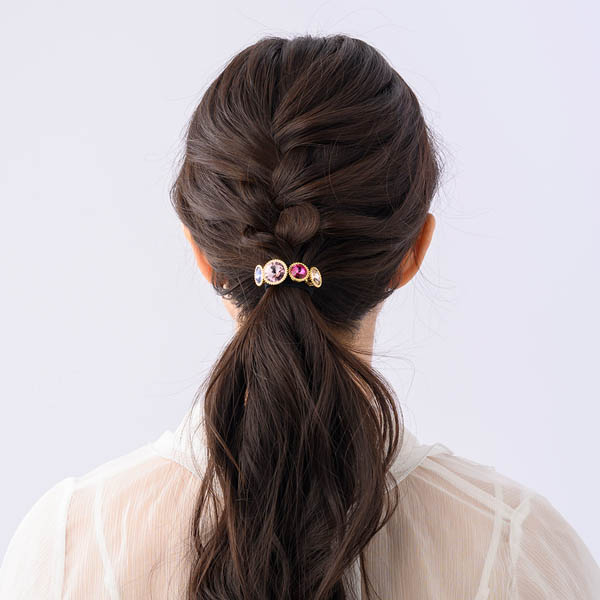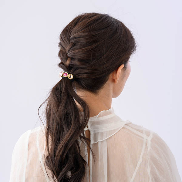 大粒のストーンがラグジュアリーな印象のポニーです。髪を一つにまとめた時にゴムが目立ちにくいデザイン。