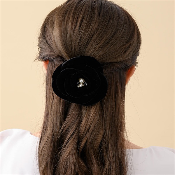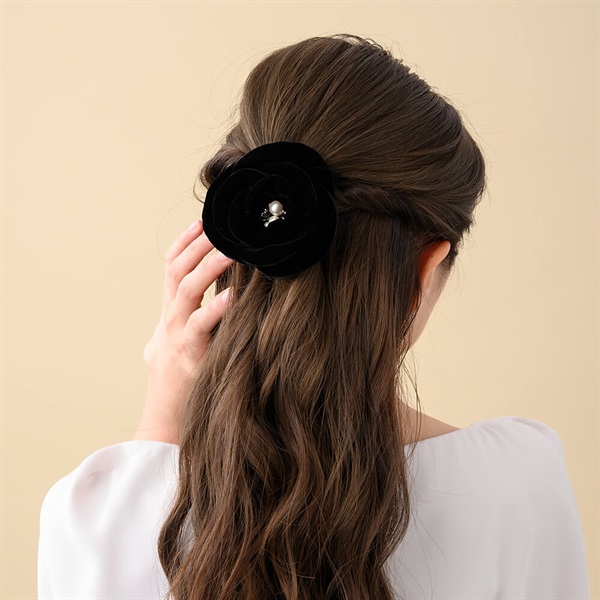 ◆デザインふっくらとしたカメリアのモチーフが優美なバレッタ。花びらに包み込まれたスワロフスキー・クリスタルの輝きが瑞々しさを感じさせるデザインです。