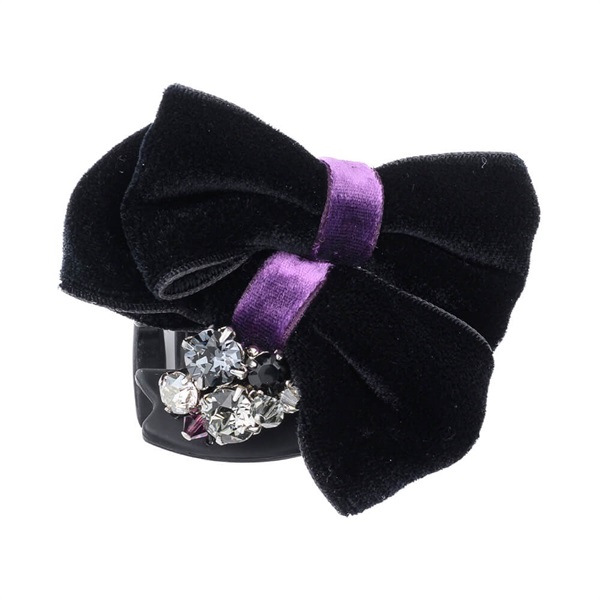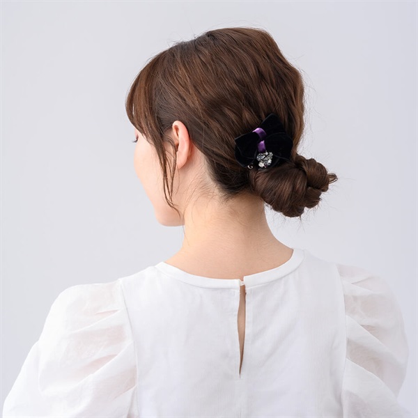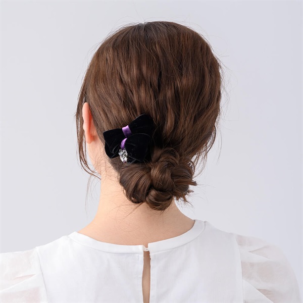 ベルベットのリボンモチーフがエレガントなデザートクリップ。上品なベルベットの光沢感とスワロフスキー・クリスタルの煌きをどちらも楽しめる贅沢なアイテムです。ハーフアップやひとつ結び、シニヨンスタイルを華やかに演出します。