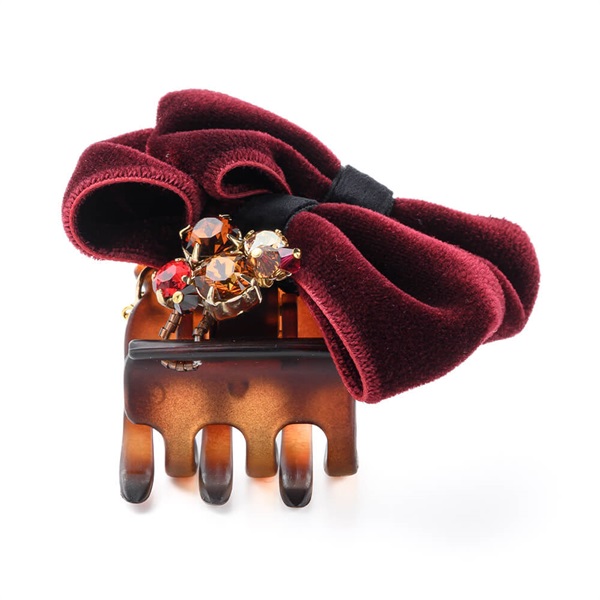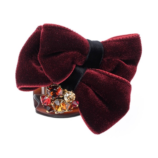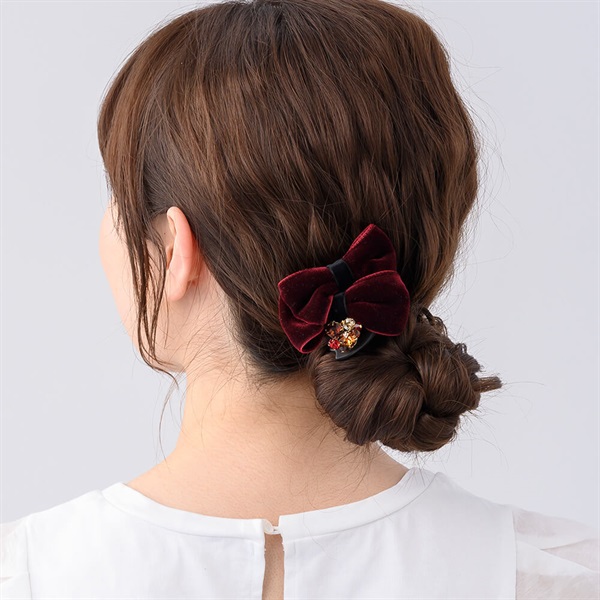 ベルベットのリボンモチーフがエレガントなデザートクリップ。上品なベルベットの光沢感とスワロフスキー・クリスタルの煌きをどちらも楽しめる贅沢なアイテムです。ハーフアップやひとつ結び、シニヨンスタイルを華やかに演出します。