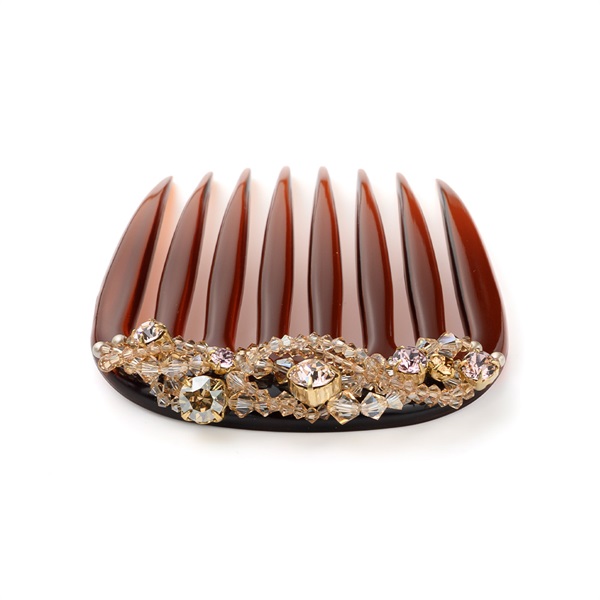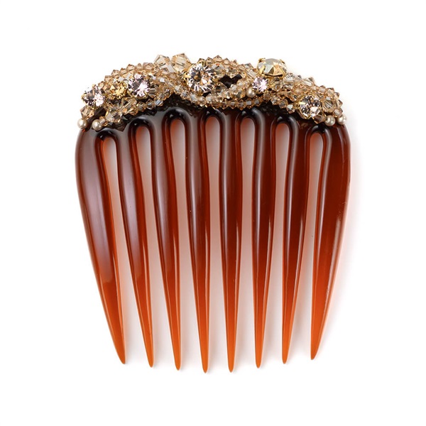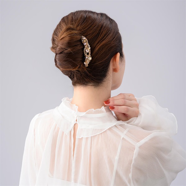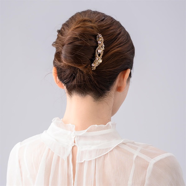 立体的に編み込まれたさまざまなサイズのスワロフスキー・クリスタルに魅せられる華やかなフレンチコーム。ヘアアレンジをエレガントに仕上げます。
