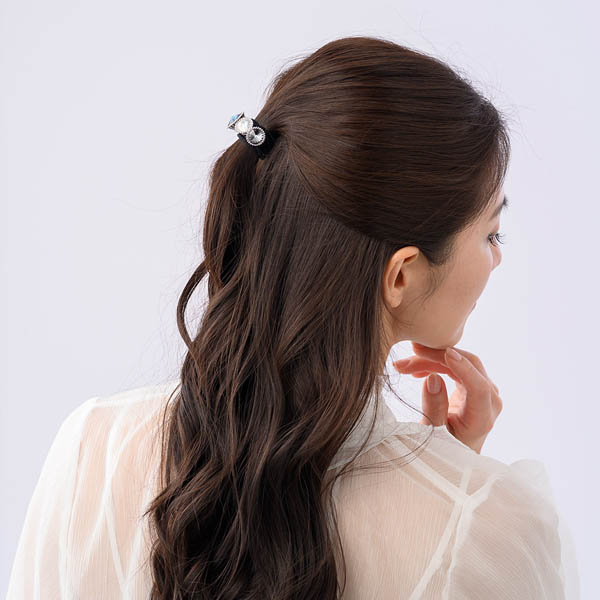 大粒のストーンがラグジュアリーな印象のポニーです。髪を一つにまとめた時にゴムが目立ちにくいデザイン。