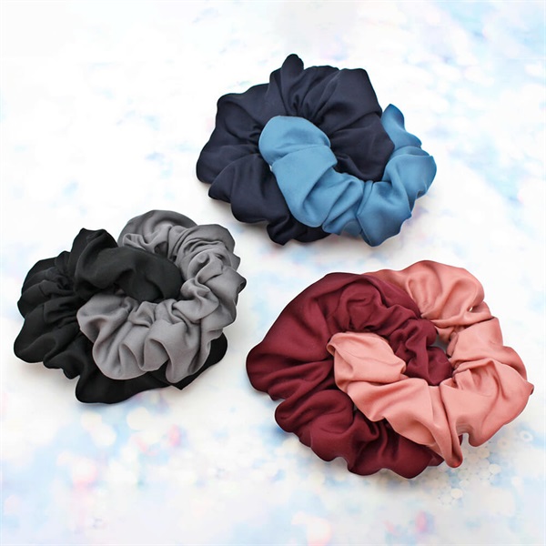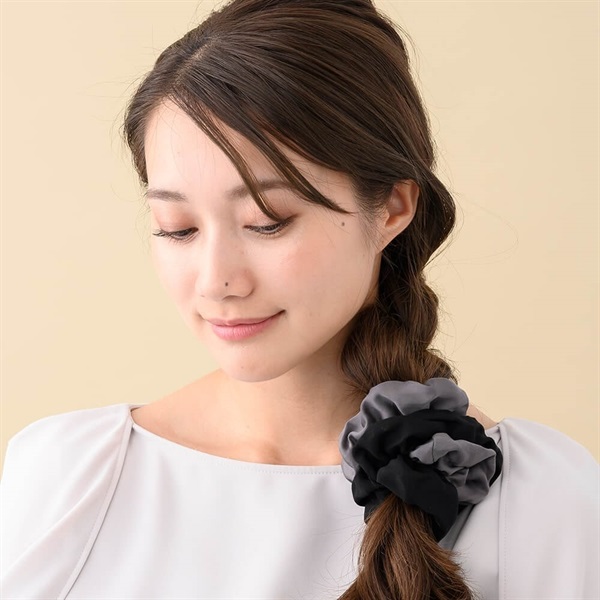 ◆デザインサテンを使用し、ボリューミーなシュシュに仕立てました。 華やかなツートーンカラーを組み合わせることで1点でも存在感のあるアイテムに。