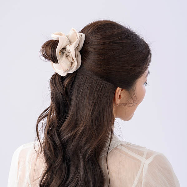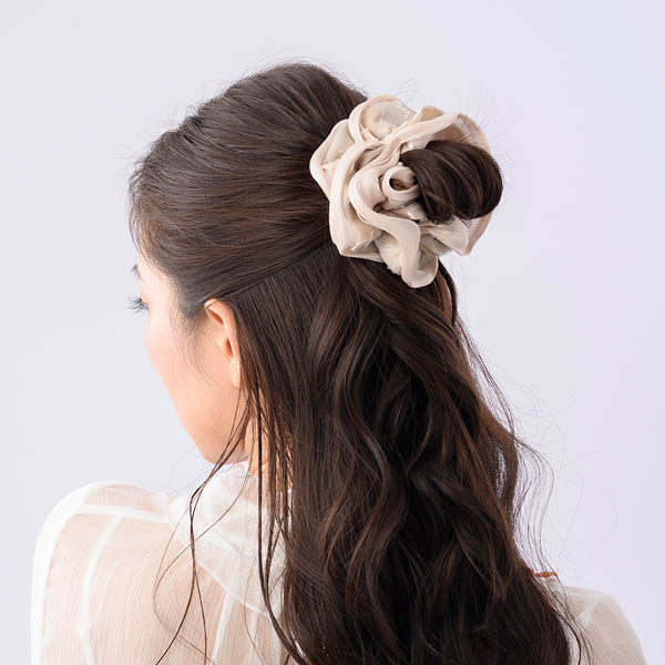 ◆アイテム ひとつでまとめ髪が華やかな印象になるシュシュ。 シュシュで結ぶとゆるみやすい、髪のボリュームが少なめの方は、先にベースを作ってからのご使用をおすすめいたします。