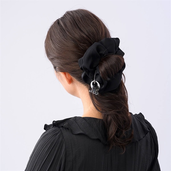 ◆アイテムひとつでまとめ髪が華やかな印象になるシュシュ。シュシュで結ぶとゆるみやすい、髪のボリュームが少なめの方は、先にベースを作ってからのご使用をおすすめいたします。
