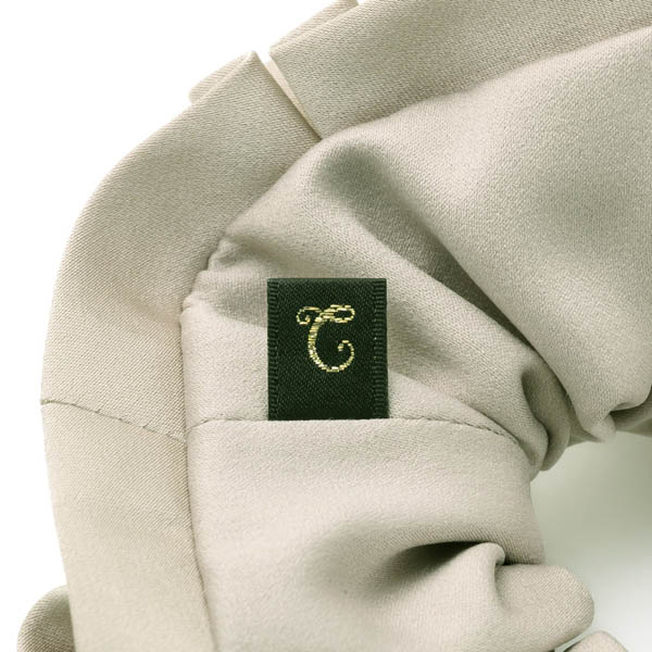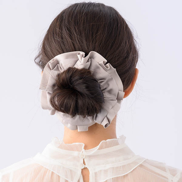 上品なフォーマルスタイルを完成させるボリューミーなシュシュ。タックを重ねたフリルが立体的に広がり、後ろ姿をエレガントに演出します。