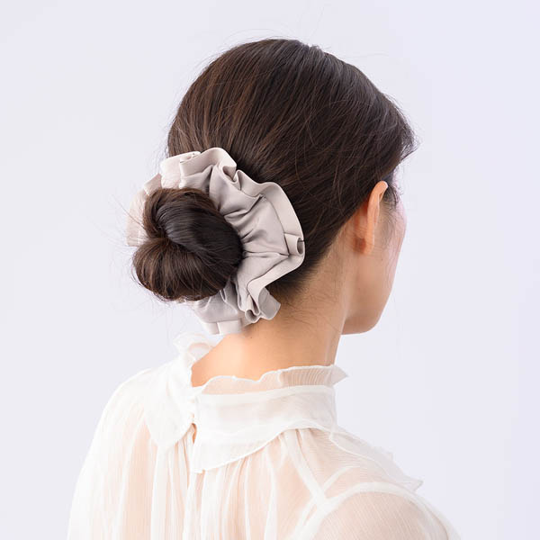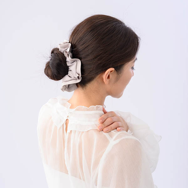 ◆アイテムひとつでまとめ髪が華やかな印象になるシュシュ。シュシュで結ぶとゆるみやすい、髪のボリュームが少なめの方は、先にベースを作ってからのご使用をおすすめいたします。