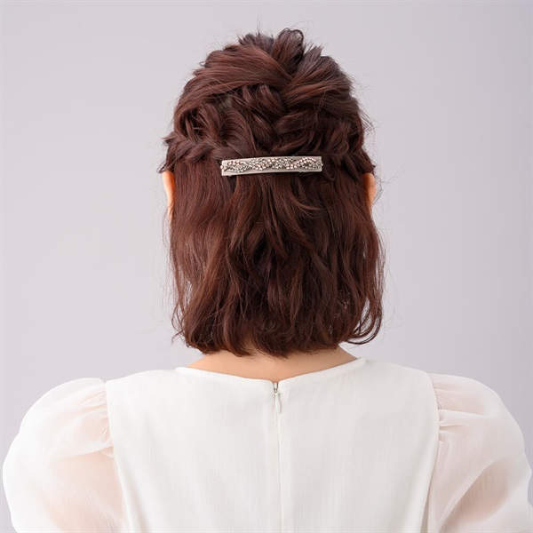 コンプレックス ビズのバレッタ金具は髪をしっかり挟み、ずれ落ち難い構造。ハーフアップの飾りや、まとめ髪の仕上げ、ダウンスタイルのアクセントにもおすすめです。