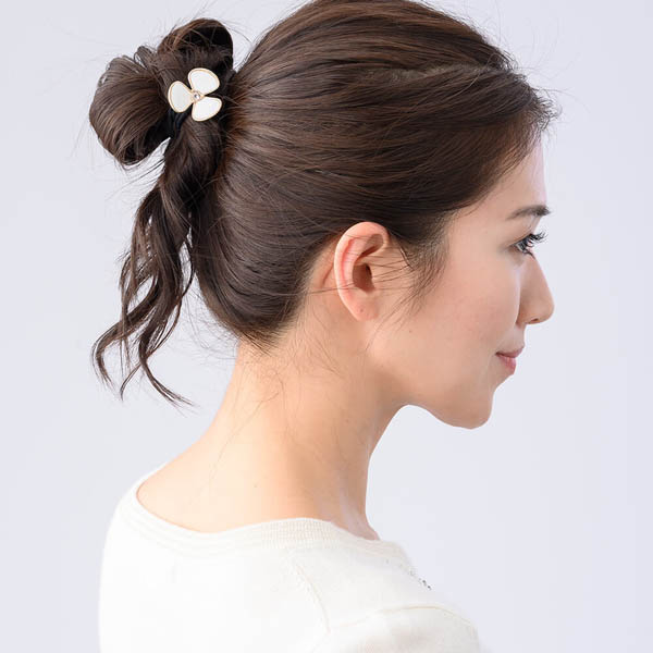 艶やかなシェルパーツが花びらのように広がる、上品な存在感のポニー。 やわらかな光をたたえるシェルに、繊細な輝きを添え、中央で凛としたきらめきを放つフラワーモチーフに仕上げました。